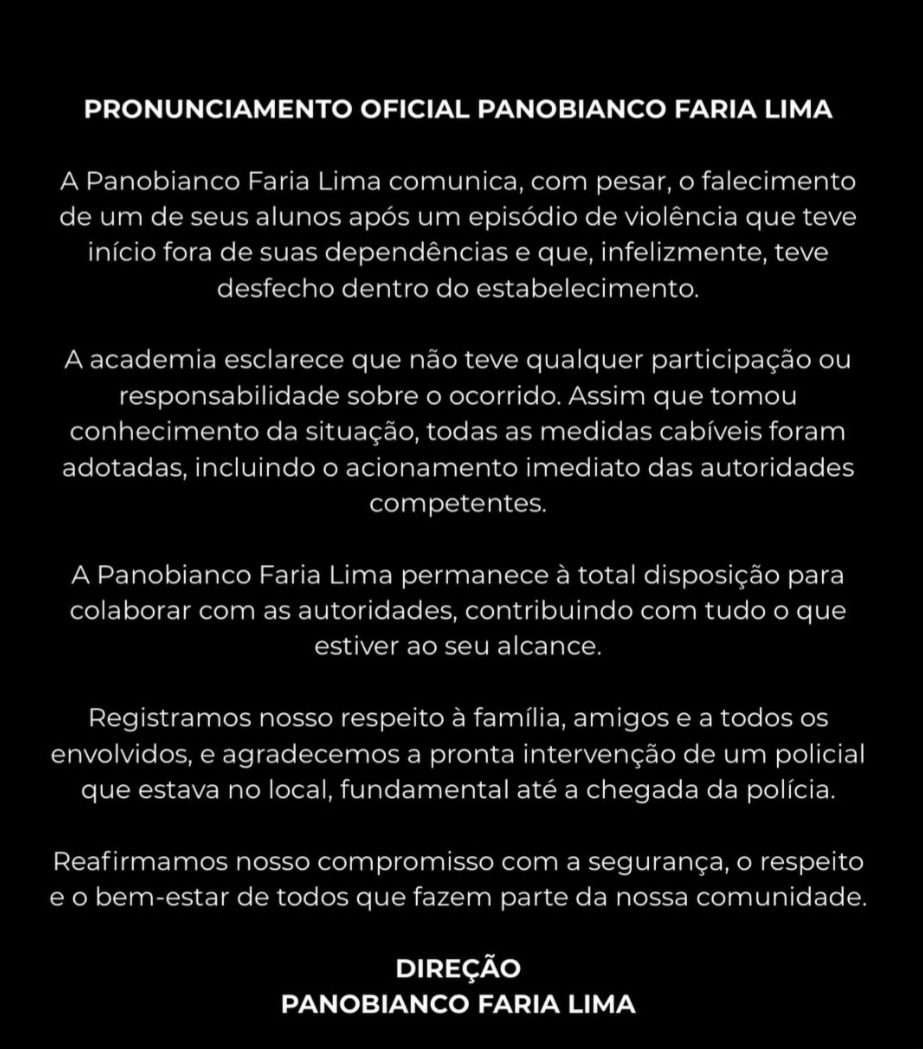 A academia afirmou, ainda, que está fechada nesta terça-feira (6) em respeito aos familiares da vítima, e deverá retomar as atividades na quarta (7).