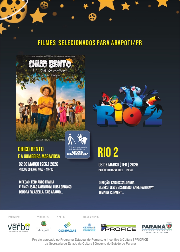 Em Arapoti, o público poderá assistir ao live-action brasileiro “Chico Bento e a Goiabeira Maraviosa”, na segunda-feira (02), e à animação “Rio 2”, na terça-feira (03), sempre às 19h30, no Parque do Papai Noel.