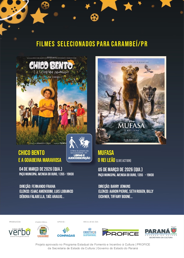 Já em Carambeí, as sessões acontecem nos dias 4 e 5 de março, às 19h30, no Paço Municipal (Avenida do Ouro, 1355). A programação inclui “Chico Bento e a Goiabeira Maraviosa”, na quarta-feira (04), e “Mufasa – O Rei Leão” (live action), na quinta-feira (05).