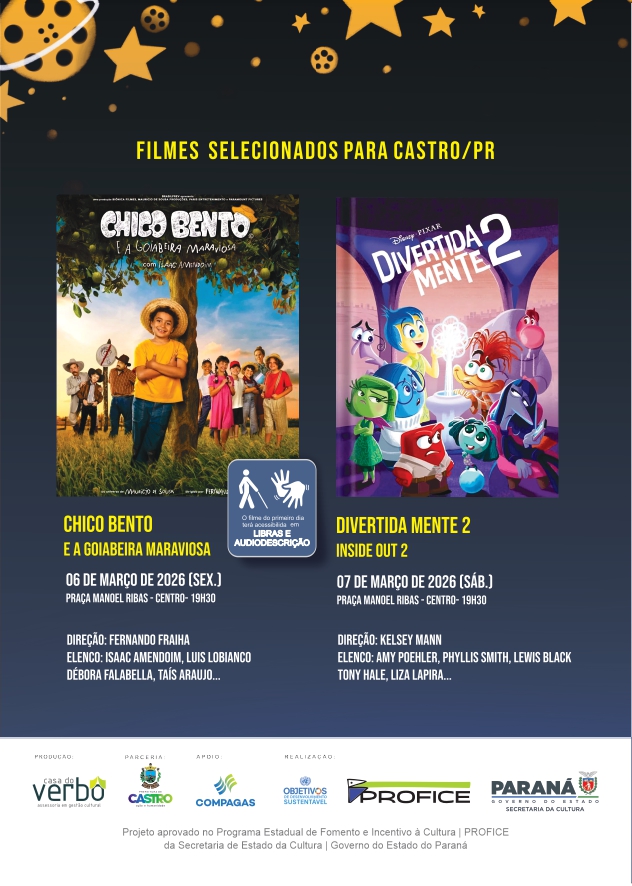 Em Castro, a Praça Manoel Ribas recebe o público nos dias 6 e 7 de março, às 19h30. Na sexta-feira (06), será exibido “Chico Bento e a Goiabeira Maraviosa”, e no sábado (07), a animação “Divertida Mente 2”.
