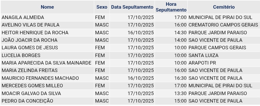 • Confira os falecimentos das últimas horas em Ponta Grossa e região 17 de outubro de 2025