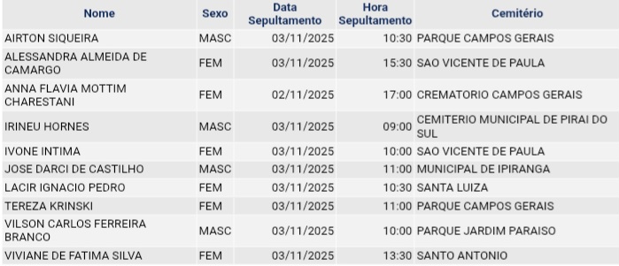 • Confira os falecimentos das últimas horas em Ponta Grossa e região 3 de novembro de 2025