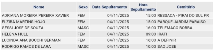 • Confira os falecimentos das últimas horas em Ponta Grossa e região 4 de novembro de 2025