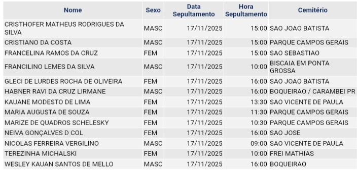 • Confira os falecimentos das últimas horas em Ponta Grossa e região 1 de dezembro de 2025