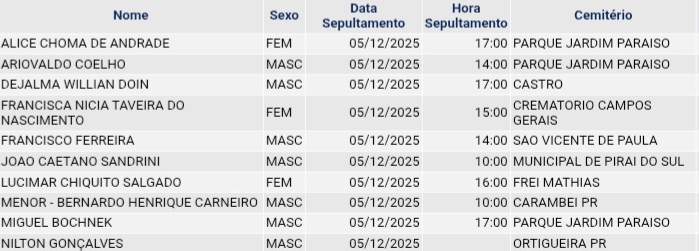• Confira os falecimentos das últimas horas em Ponta Grossa e região 22 de dezembro de 2025