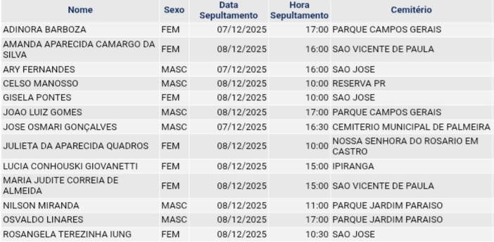 • Confira os falecimentos das últimas horas em Ponta Grossa e região 22 de dezembro de 2025