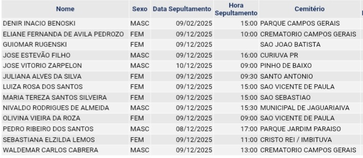 • Confira os falecimentos das últimas horas em Ponta Grossa e região 19 de dezembro de 2025