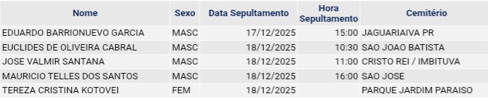 • Confira os falecimentos das últimas horas em Ponta Grossa e região 19 de dezembro de 2025
