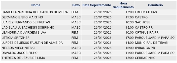 • Confira os falecimentos das últimas horas em Ponta Grossa e região 10 de fevereiro de 2026