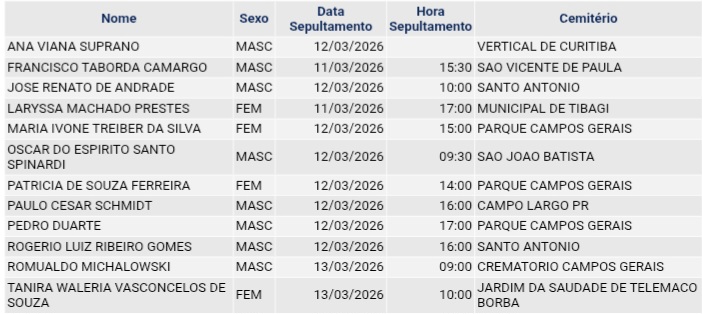 • Confira os falecimentos das últimas horas em Ponta Grossa e região 12 de março de 2026