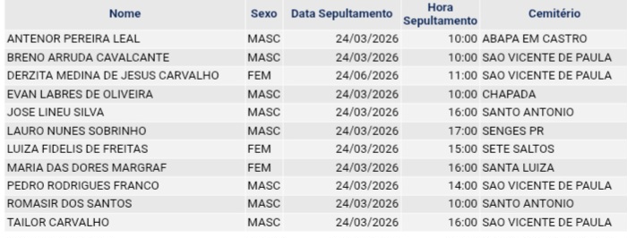 • Confira os falecimentos das últimas horas em Ponta Grossa e região 1 de abril de 2026