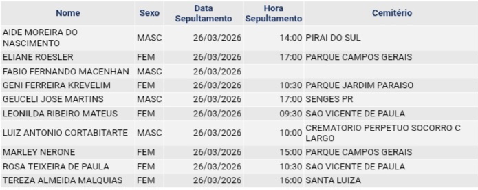 • Confira os falecimentos das últimas horas em Ponta Grossa e região 1 de abril de 2026