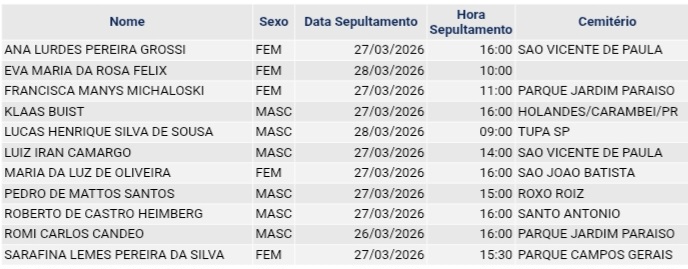 • Confira os falecimentos das últimas horas em Ponta Grossa e região 1 de abril de 2026