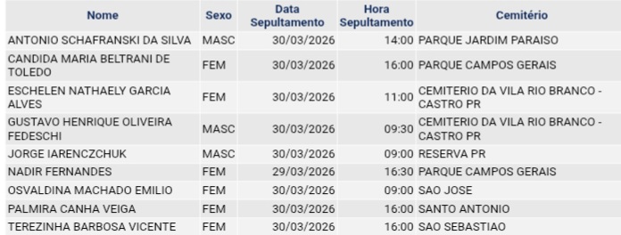 • Confira os falecimentos das últimas horas em Ponta Grossa e região 1 de abril de 2026