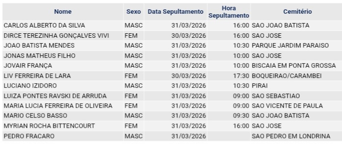 • Confira os falecimentos das últimas horas em Ponta Grossa e região 1 de abril de 2026