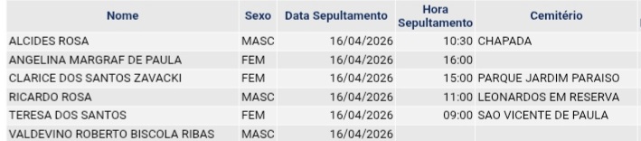 • Confira os falecimentos das últimas horas em Ponta Grossa e região 16 de abril de 2026