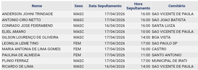 • Confira os falecimentos das últimas horas em Ponta Grossa e região 17 de abril de 2026
