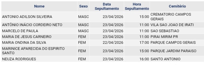 • Confira os falecimentos das últimas horas em Ponta Grossa e região 23 de abril de 2026