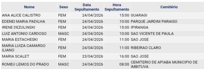 • Confira os falecimentos das últimas horas em Ponta Grossa e região 24 de abril de 2026
