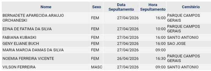 • Confira os falecimentos das últimas horas em Ponta Grossa e região 27 de abril de 2026