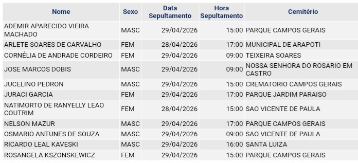 • Confira os falecimentos das últimas horas em Ponta Grossa e região 29 de abril de 2026
