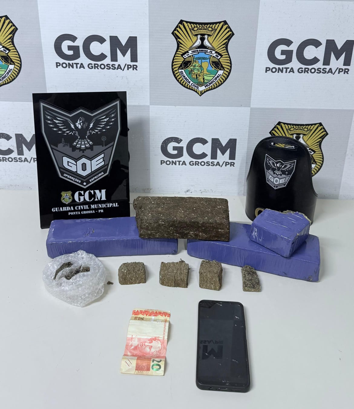 Nas buscas, foram localizados cerca de 3 kg de substância análoga à maconha. Em busca pessoal, a GCM encontrou um celular e dinheiro com os suspeitos.