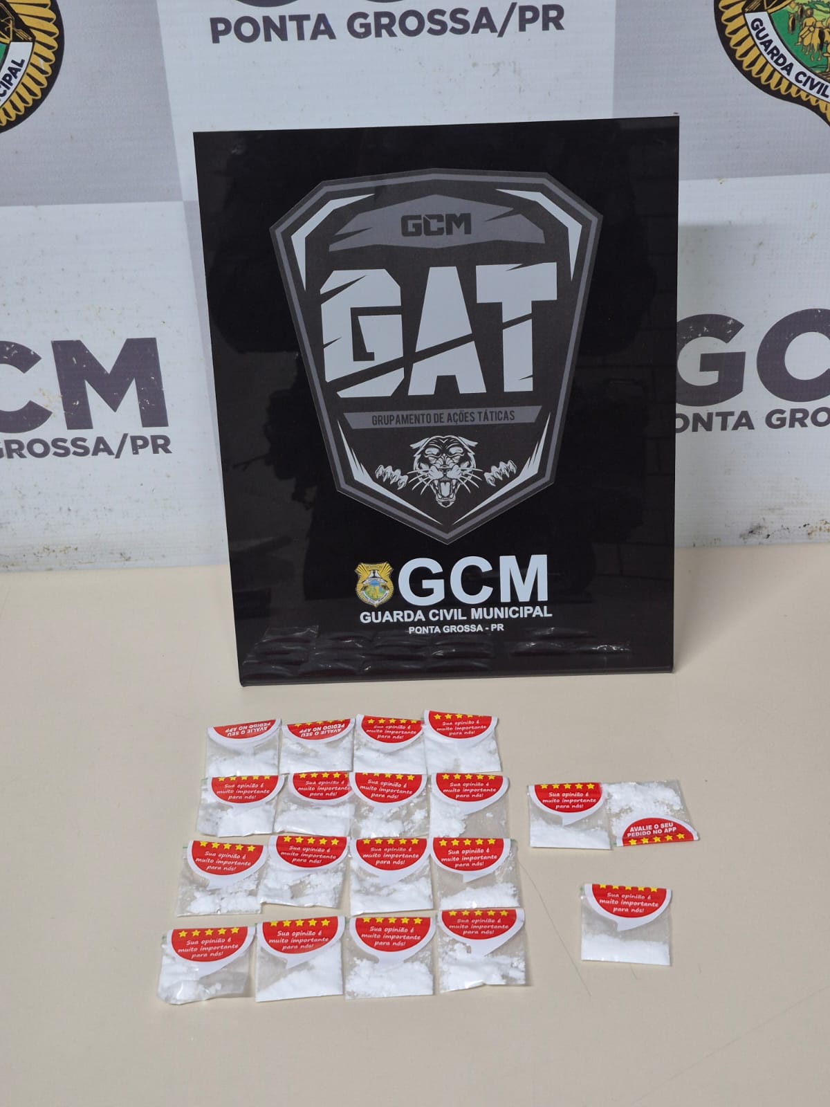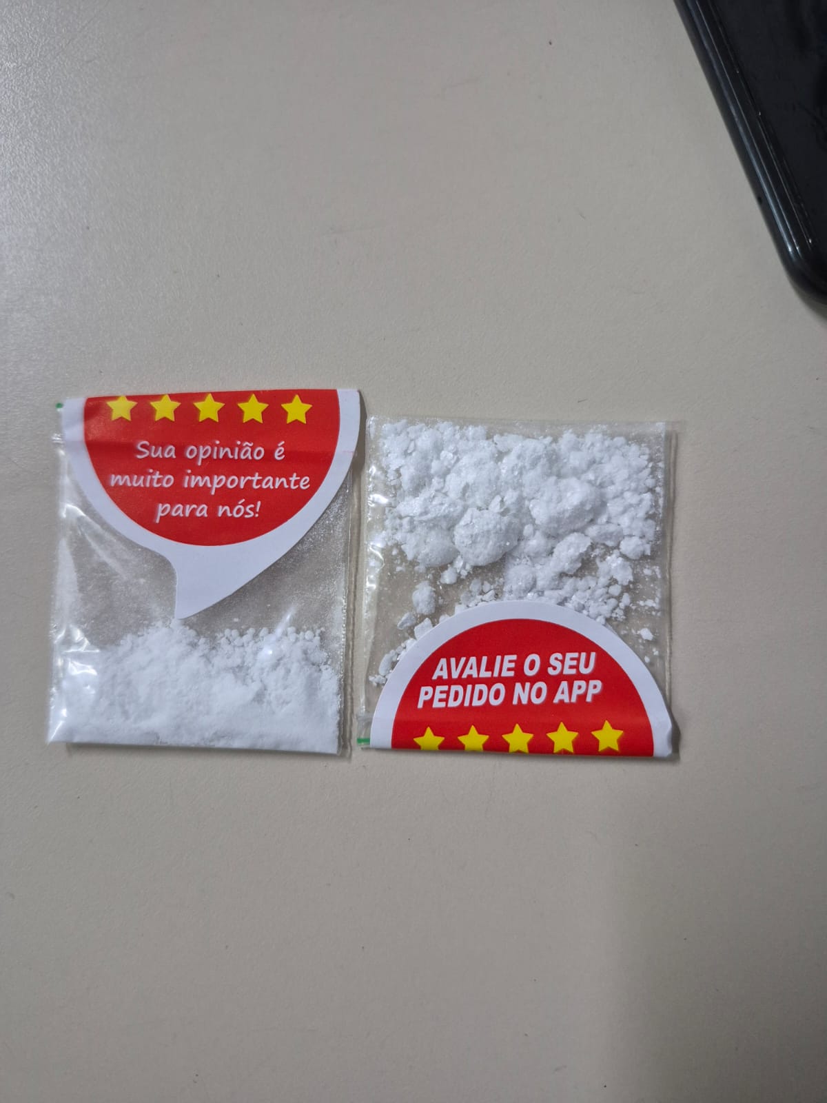 A equipe deu voz de abordagem, e em revista pessoal, foram encontrados dois aparelhos celulares, dinheiro em notas trocadas e 19 invólucros de substância análoga à cocaína, totalizando aproximadamente 18 gramas.