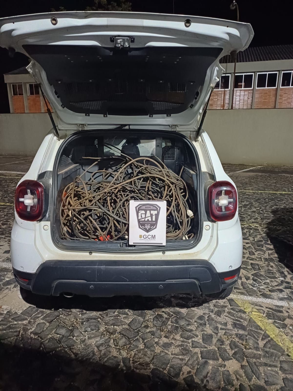 Ao chegar ao local, a equipe encontrou um cidadão sentado sob custódia de funcionários da empresa. O solicitante relatou que havia percebido uma movimentação suspeita na parte dos fundos da empresa e visualizou o suspeito carregando um carrinho de mão com fio de energia. Com a ajuda de um companheiro de trabalho, o suspeito foi detido até a chegada da equipe.