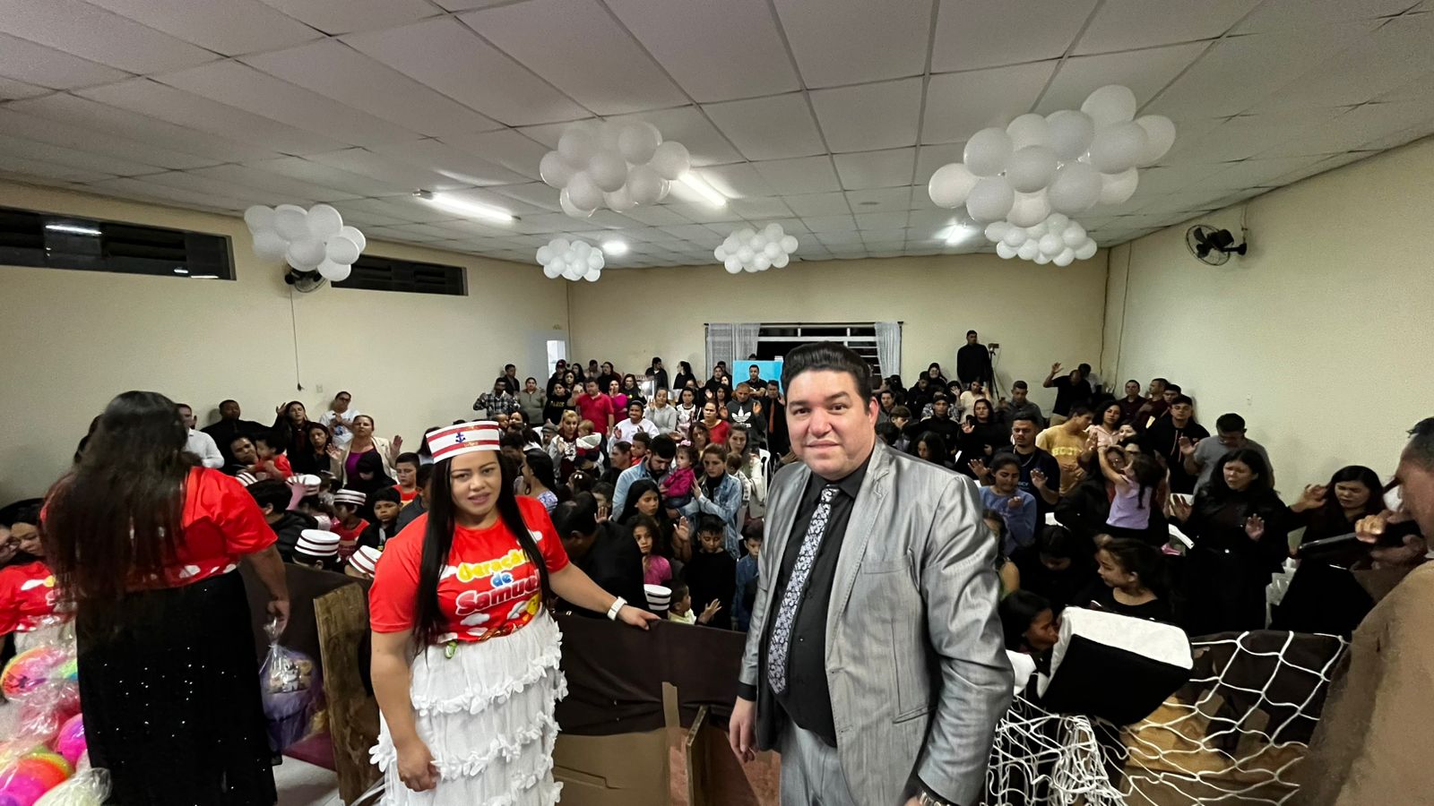 Durante a celebração, o Pastor Leandro Cardoso e a evangelista Jhennifer Cardoso realizaram uma oração especial por todas as famílias presentes, levando uma mensagem de fé, amor e gratidão.