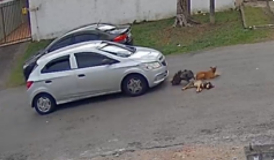 Uma câmera de segurança registrou o momento em que três cães são atropelados no bairro de Santa Maria, em Piraquara. Os animais estavam dormindo na rua quando foram atingidos pelo veículo.