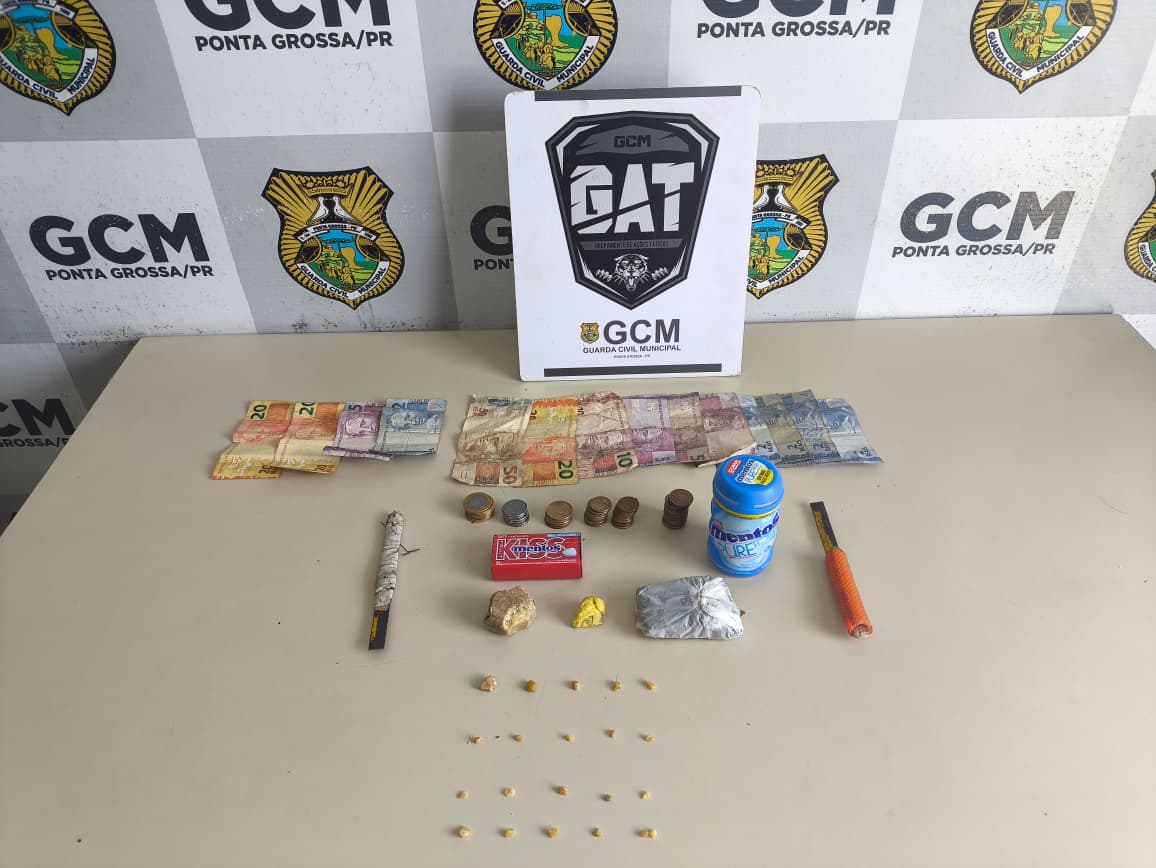 Simultaneamente, um segundo indivíduo, ao visualizar a equipe, mudou repentinamente de sentido e dispensou um objeto de cor azul ao solo. Ao verificar o objeto, constatou-se tratar de duas pedras brutas de substância análoga ao crack, totalizando 29,4 gramas. Além disso, foi encontrado em posse do indivíduo um tablete de substância análoga à maconha, totalizando 45 gramas.