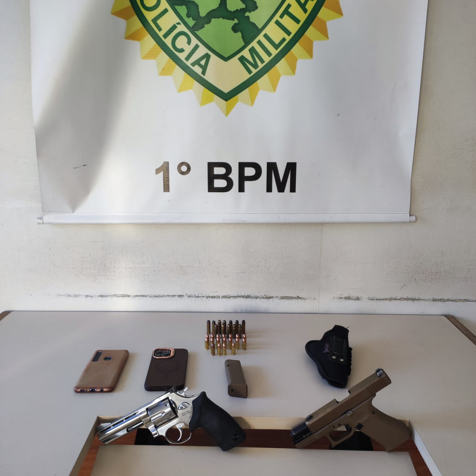 Durante a abordagem, os policiais localizaram com um homem uma pistola calibre 9mm, um revólver calibre .38, além de 12 munições calibre .38 e 18 munições calibre 9mm.