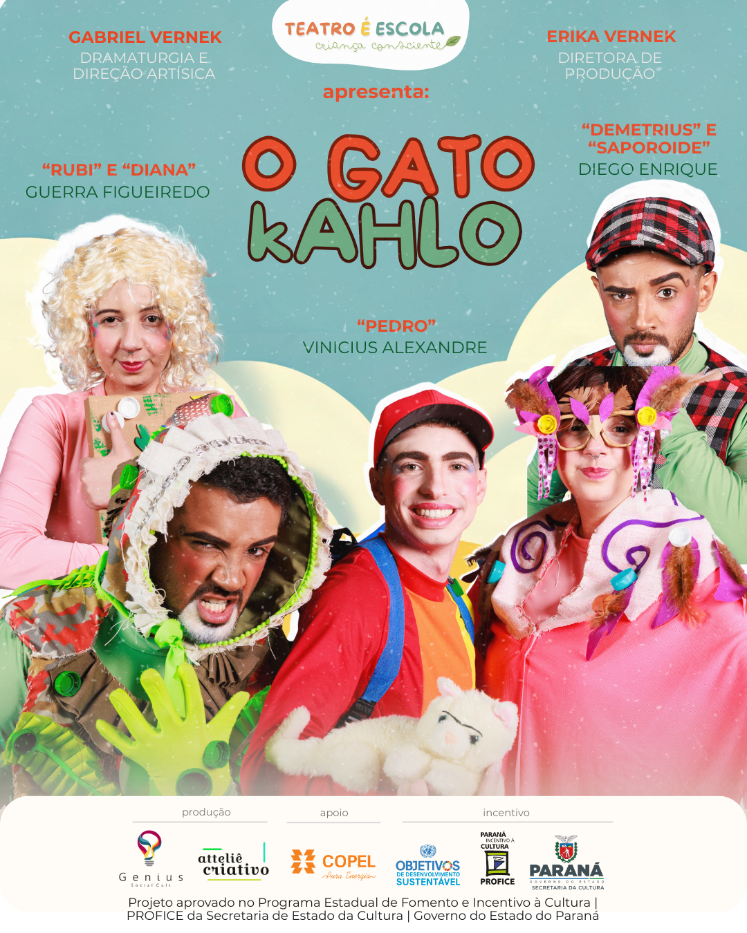 As apresentações gratuitas acontecerão dentro das próprias escolas, atingindo diretamente os estudantes e educadores. O espetáculo O Gato Kahlo, com dramaturgia e direção artística de Gabriel Vernek, abordará temas como consumo consciente, descarte correto de resíduos, economia de água e energia, e a relação com a natureza – tudo isso de forma leve, encantadora e próxima do universo infantil.