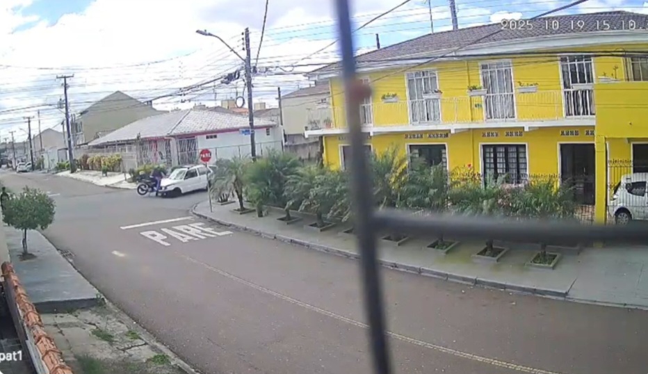 Vídeo de uma câmera de segurança (veja abaixo) mostra o momento em que genro e sogra foram “ejetados” de uma moto, após acidente com um carro, na tarde deste domingo (19), no bairro Sítio Cercado, em Curitiba.